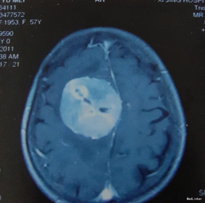 患者女,57岁,主因”头痛、头晕伴左侧肢体无力半月“入院。 患者于入院前半个月无明显诱因出现头痛、头晕,伴左侧肢体无力,行走时步态不稳,遂至当地医院就诊。无癫痫病史,无其他特殊不适,既往无特殊病史。