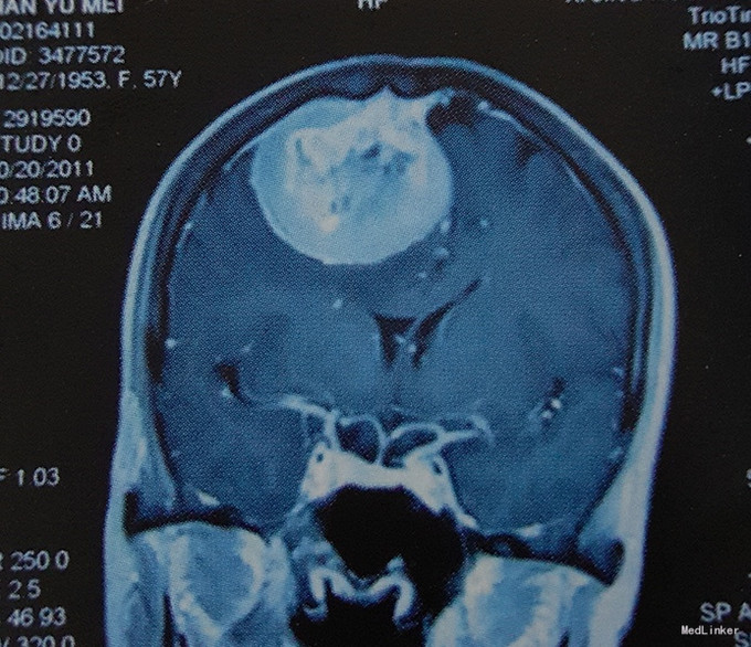 查体:心肺腹体检无明显异常,生命体征平稳,左上肢及左下肢肌力IV级,右侧肢体肌力V级,四肢肌张力正常,其他神经系统检查无明显异常。 颅脑MRI增强扫描:右顶部中央沟区矢状窦-镰旁巨大占位,强化效应明显,质地均匀边界清,中线及周围脑组织明显受压。