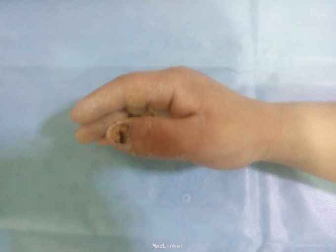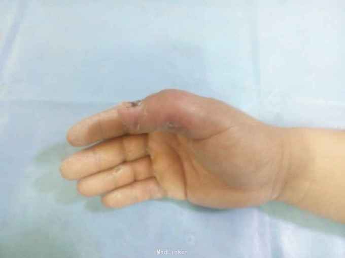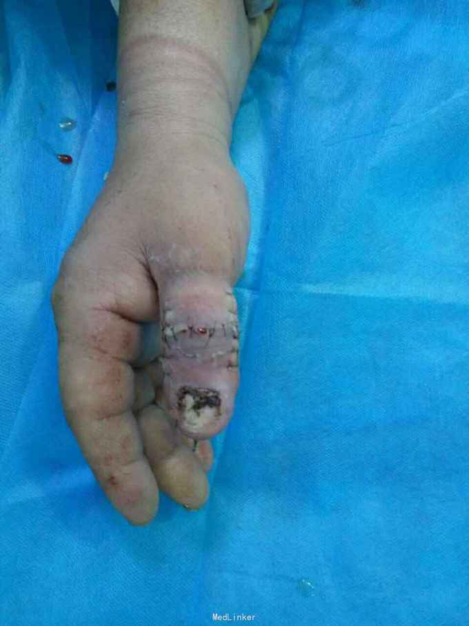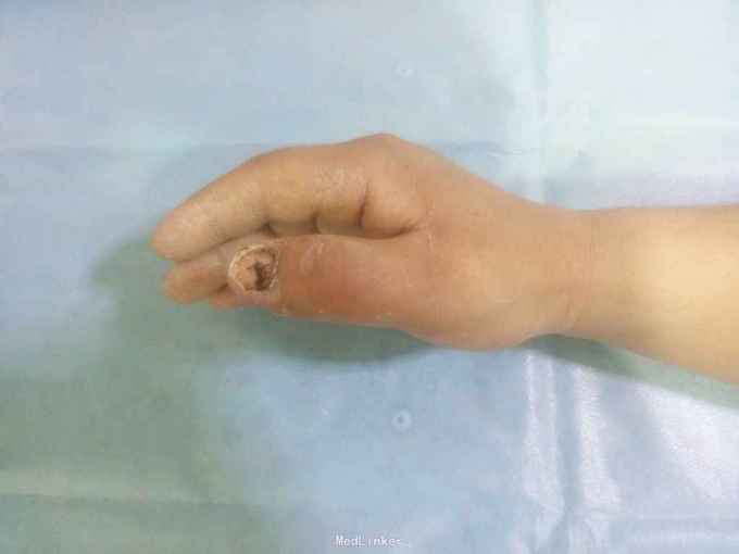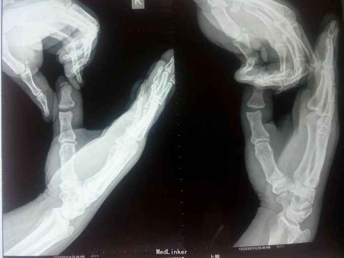 扭伤右拇指疼痛肿胀活动受限20余天 患者20天前劳作时不慎被重物扭伤右拇指,即刻出血,肿胀,当地诊所给与拔甲抗炎输液,未见明显好转,为求进一步诊治来我院
