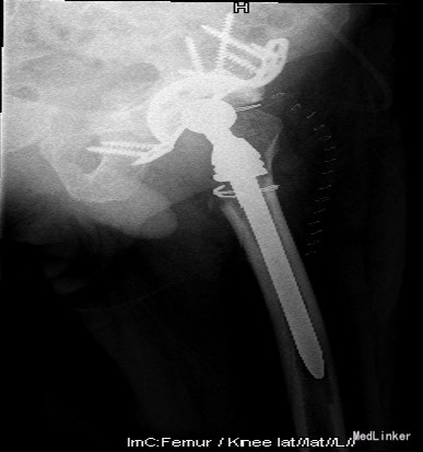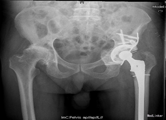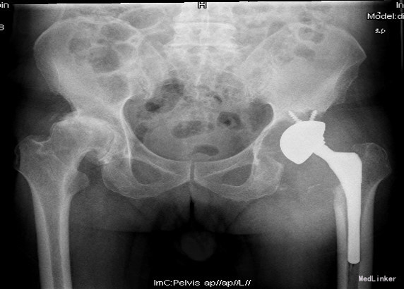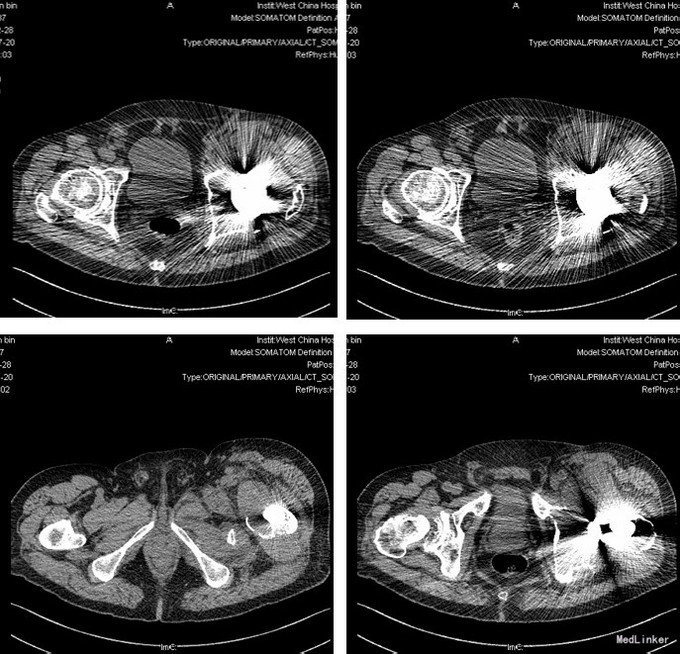 主诉:左全髋置换后再发疼痛伴活动受限8月,加重20天 现病史:老年男性,起病缓,病程长,8年前出现双髋活动时疼痛,左侧重,休息后缓解,症状逐渐加重伴髋关节活动受限,在当地医院行左侧全髋关节置换术,8月前活动后感左髋疼痛,活动受限,伴左腹股沟区肿胀,在当地医院诊断:左髋臼假体松动移位伴局部血肿形成,行髋臼假体复位及血肿穿刺术,术后疼痛缓解,20天前左髋肿胀及疼痛加重,服用西乐葆止痛及休息后缓解不明显,发现高血压14年,服氨氯地平5mg每日一次,血压波动在145/85mmHg左右。