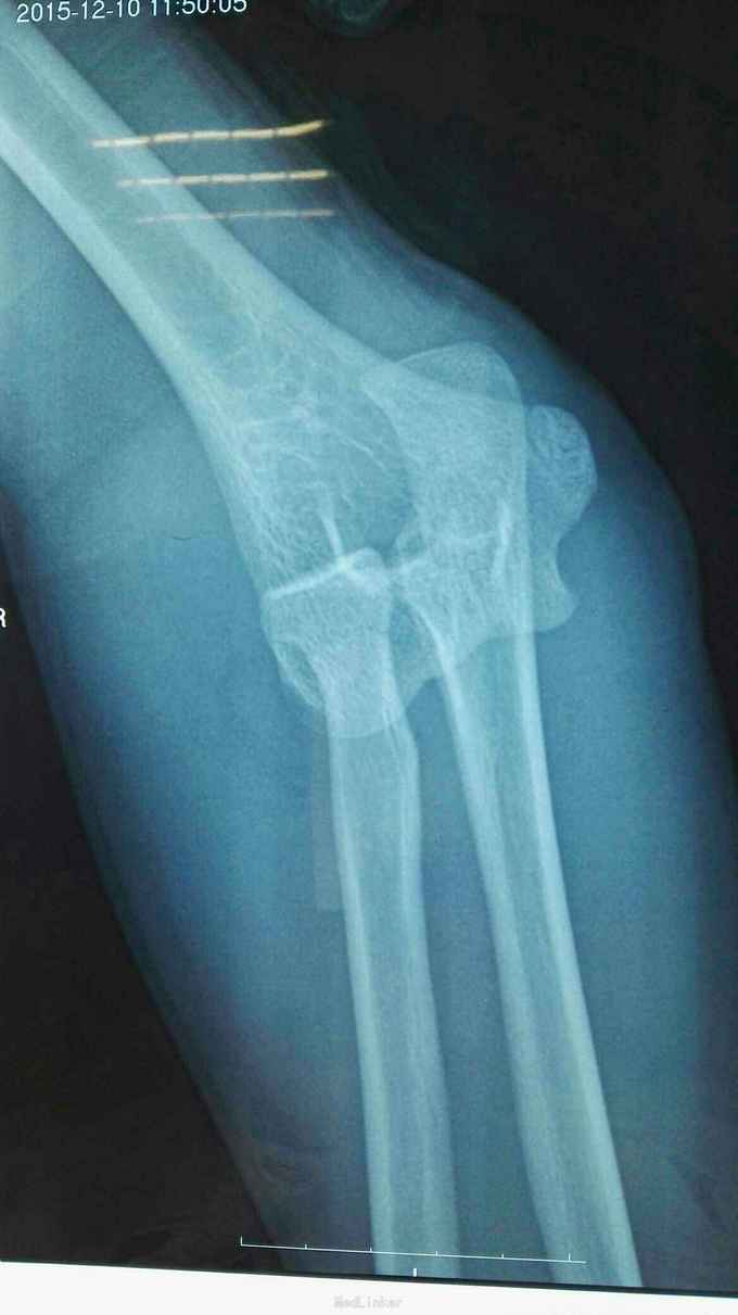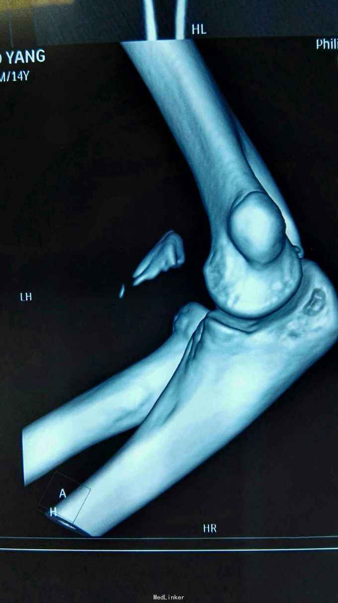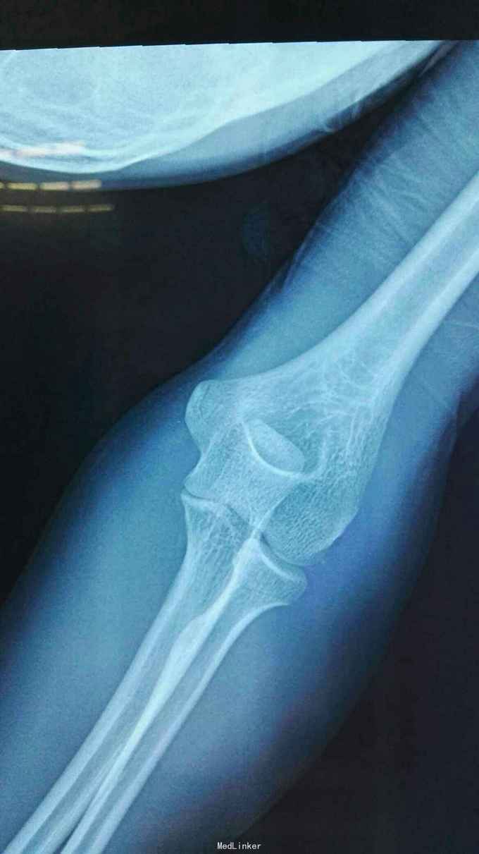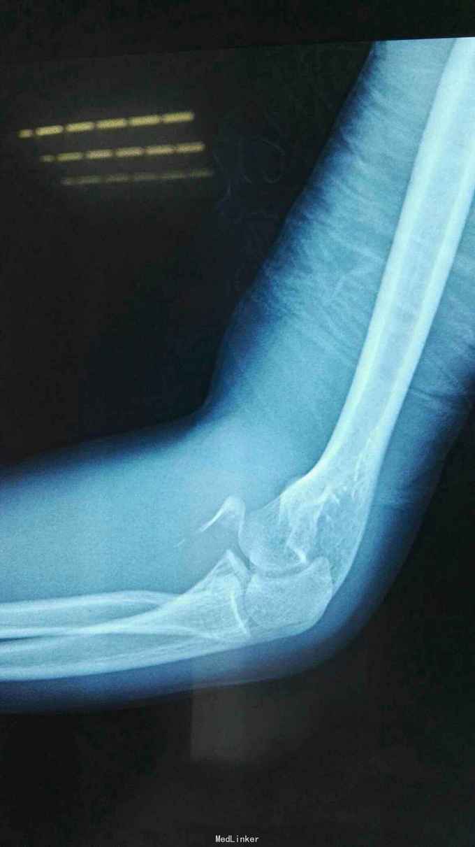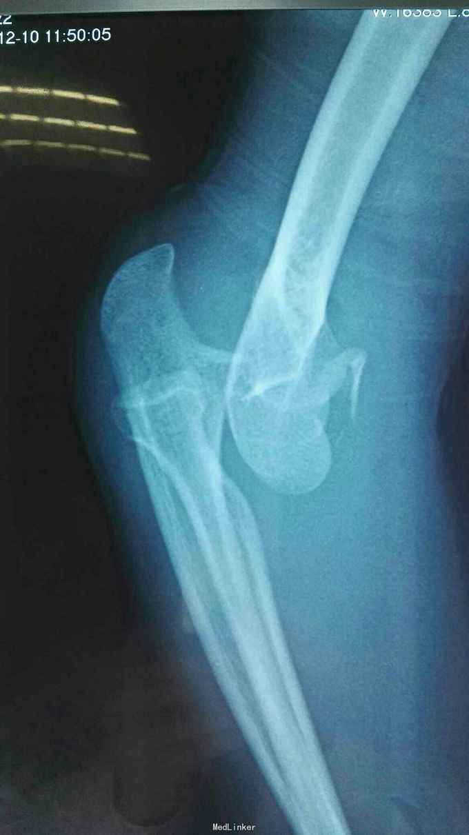 右肘跌伤疼痛伴不能活动1天。 患者,男,14岁,1天前跌倒,感右肘部剧痛,不能活动,急送当地医院拍片示:右肘关节脱位,尺骨冠狀突骨折,右桡骨小头骨折,行手法复位,今来我院就诊。