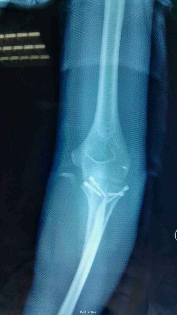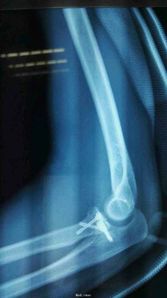 诊断:右肘恐怖三联症。 治疗:伤后第6天在全麻下行右肘恐怖三联症切开复位内固定术,术中先取肘外侧弧形切口,显露桡骨头,用2枚埋头螺钉固定桡骨头,见右肘外侧副韧带尺侧束断裂,用锚钉固定外侧副韧带。取右肘内侧弧形口,显露冠状突,见冠状突骨折块很小,移位较远,复位,2枚螺钉固定,内侧副韧带前束断裂,修补,术后石膏因定。