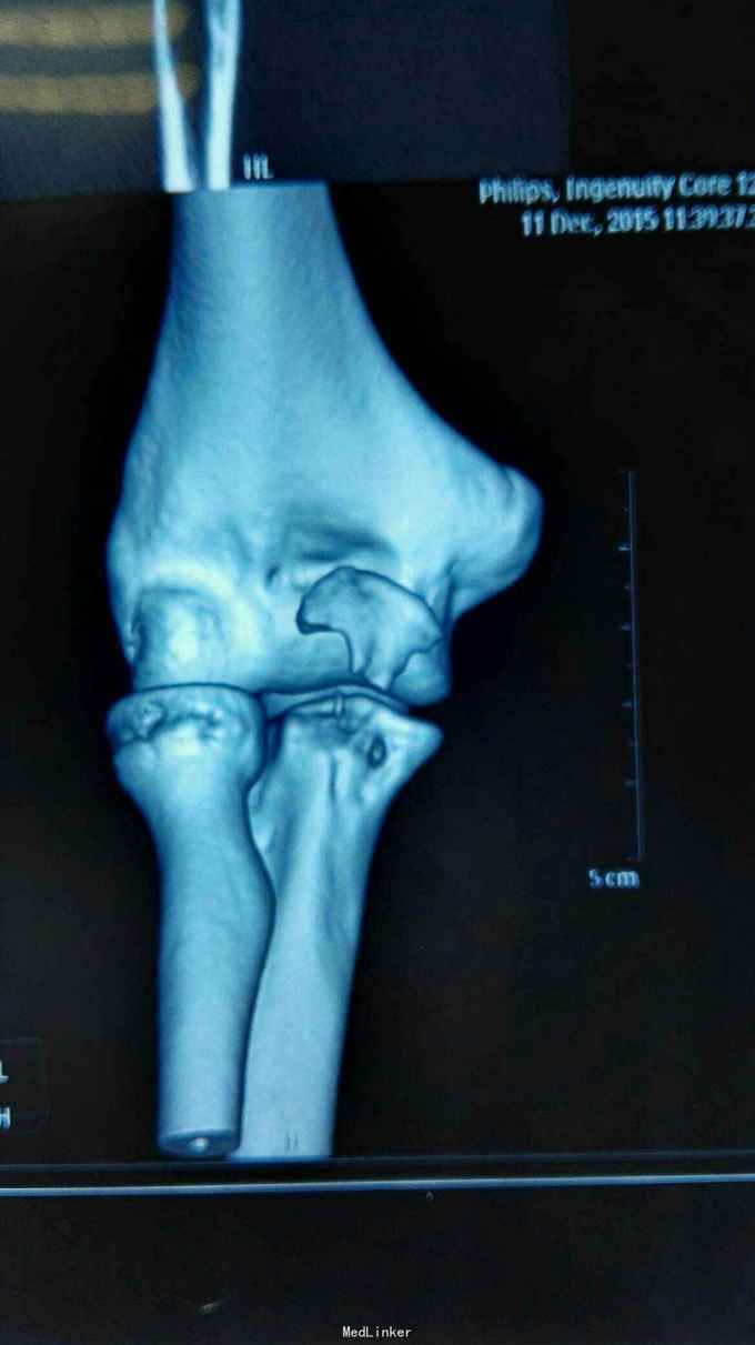 查体:右肘关节高度肿胀,触痛,活动功能障碍手指末端感觉血运正常。 辅查:x线,CT:右肘关节脱位,右尺骨冠突骨折,右桡骨小头骨折