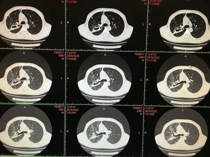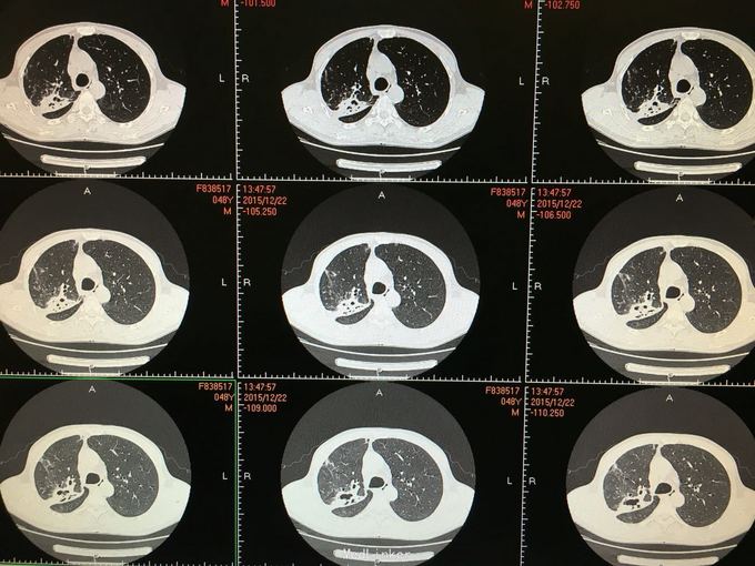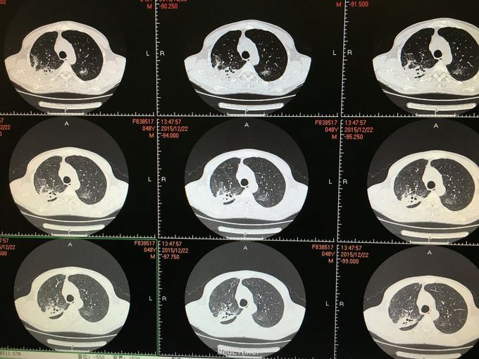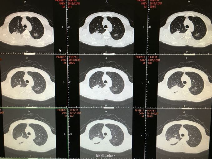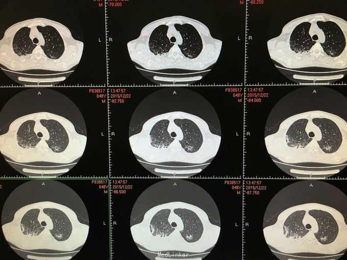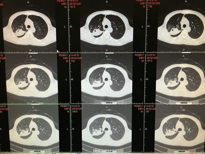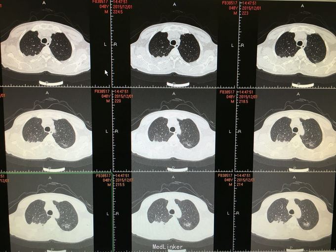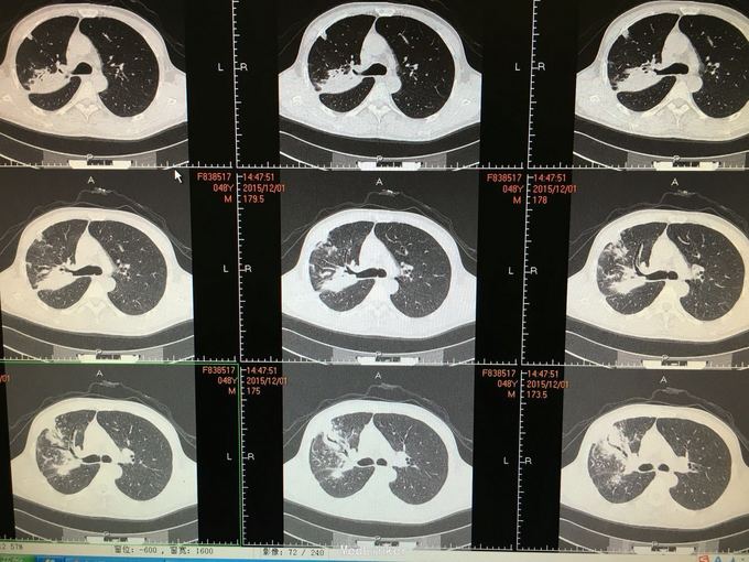 间断咳嗽咳痰5月余。患者缘于半年前确诊为骨髓增生异常综合征,并行造血干细胞移植术。术后出现发热,完善相关检查考虑为肺部真菌感染,给予抗感染治疗后体温正常,病情好转出院。出院后仍有间断咳嗽咳痰,咳黄色痰,无发热,自行口服伏立康唑200mg,2/日治疗,12月初复查CT提示双肺病灶较前进展,右肺中叶新增病灶。