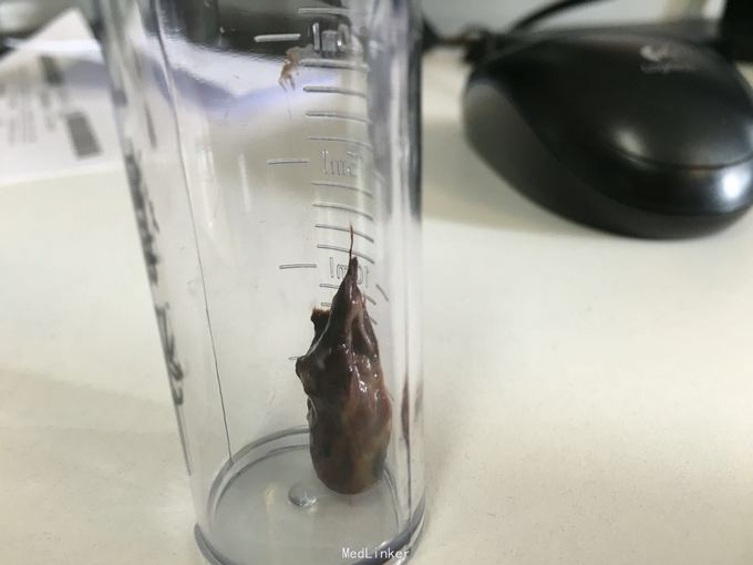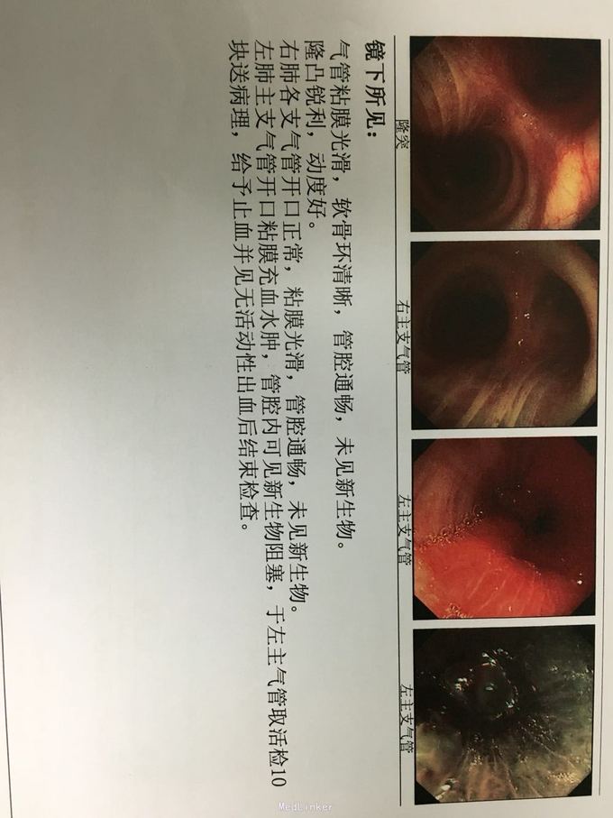 根据症状体征及辅助检查,结合病史考虑真菌感染可能性大。进一步气管镜检查,结果如下。组织活检标本可见。病理回报提示真菌团,培养见曲霉菌生长。明确诊断后给予两性霉素B雾化吸入及伏立康唑静脉应用抗真菌治疗,同时给予环孢素口服。