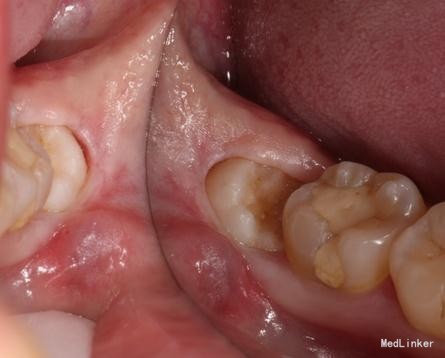 检查: 18.28颌面龋坏,质地软,牙颈部脱矿,叩诊(-),不松动。 37玻璃充填物,叩诊(-),不松动,冷热刺激正常。 38近中水平阻生,牙龈无红肿,叩诊(-),探诊有盲袋,盲袋内食物碎屑。 47缺失多年,48近中向移位,间隙1mm,叩诊(-),不松动。