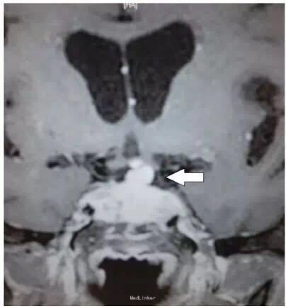 体格检查显示双眼完全性上睑下垂。双侧动眼神经麻痹,右侧外展神经麻痹,水平性前庭 - 眼反射受损,瞳孔反射受损。视野和肌力检查正常。 血清钠为 112 mmol/L(正常值为 136-145 mmol/L);清晨皮质醇水平为 57 nmol/L(正常值为 171-536nmol/L)。甲状腺功能检查正常。