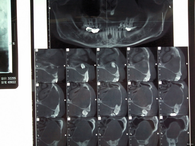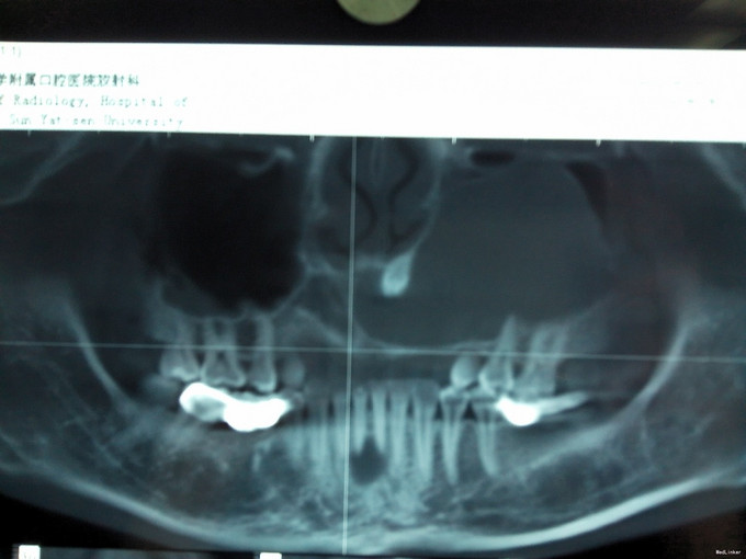 患者男,28岁, 主诉: 发现左上颌骨囊肿2周余 现病史: 患者2周前因下前牙疼痛于当地医院就诊拍全景片发现左上颌骨囊肿,偶伴左侧鼻塞,无上颌牙齿疼痛、颌面部麻木及疼痛、流涕、复视等明显不适. 既往史: 诉多年前下前牙曾行"杀神经治疗",2年半前下前牙区颊侧牙龈瘘管,伴疼痛,流脓. 余病史无特殊.