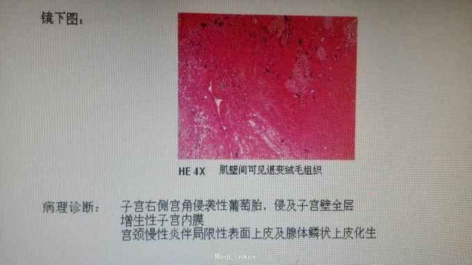 宫腔镜检查活检结果提示右侧宫角侵袭性葡萄胎。完善相关检查后行5-FU+MTX+VP16全身化疗,患者恢复尚可,无明显不适。