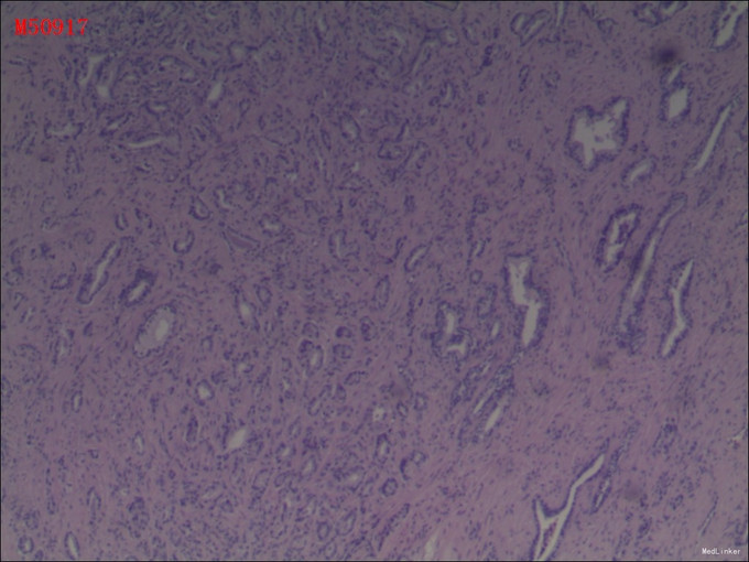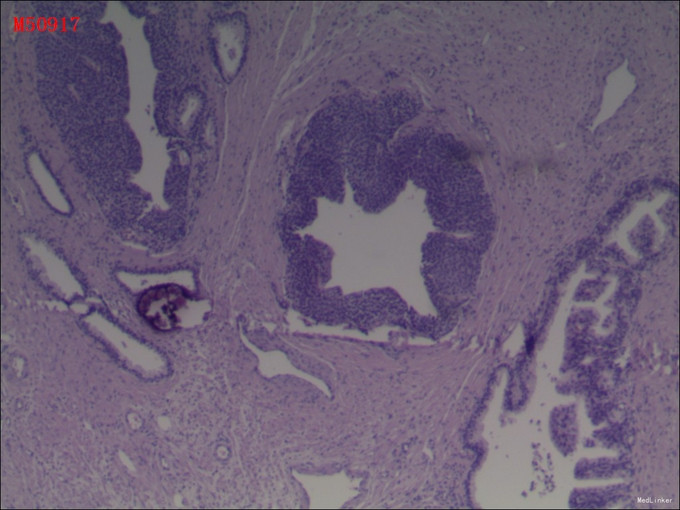 外院前列腺MRI示:前列腺中叶肥大,多发增生结节,中央叶偏左侧结节不排除恶性可能。 我院行经直肠B超前列腺穿刺活检术,术后病理提示:前列腺癌,Gleason评分 3+3=6分