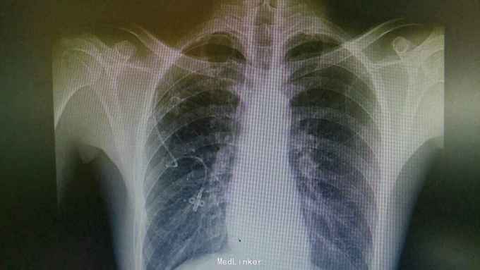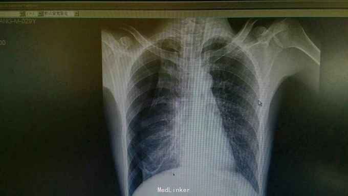 诊断:右肺气胸。 治疗:排除胸腔穿刺禁忌,予以闭式胸腔引流排气。后辅查胸片:右肺液气胸,压缩5%。