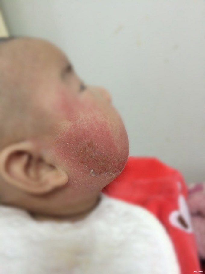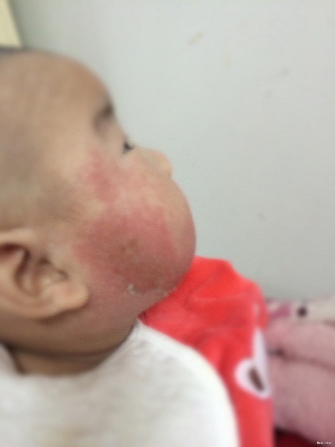 患儿,男,4个月。 因“面部,躯干起疹伴痒3月余”入院。 患儿3月前无明显诱因,双上睑出现红斑、丘疹,后逐渐发展至整个面部,头皮,颈部,躯干,伴明显瘙痒,后曾先后就诊于多家医院,给予外用药物治疗后无明显好转。既往史无特殊。