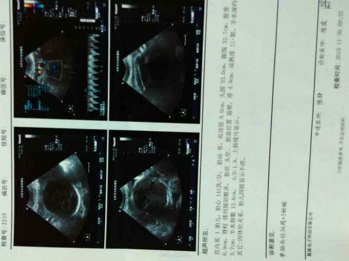 T36.5°C BP120/70 mmHg,心肺听诊 无异常,腹彭隆,肝脾肋下未及,下腹见一长约12cm横行瘢痕。 产科检查:宫高:30cm,腹围:103cm,胎位ROA,胎心138次/分,宫口开大2cm,胎膜未破,头先露,S-1.