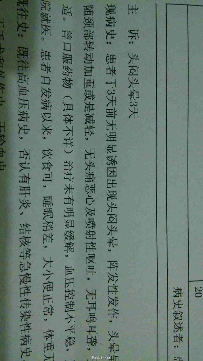 头晕头闷三天。 患者三天前出现头晕头闷,头晕非旋转性,阵发性发作,不随颈部转动加重减轻,不恶心呕吐,无耳鸣耳聋,无发热咽痛及全身不适,有高血压病史,且控制不稳定。