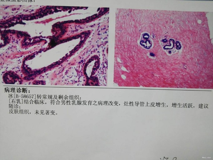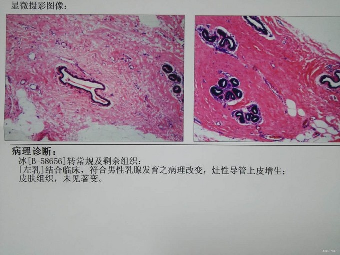 入院后完善术前相关检查,无明显手术禁忌症,全麻下行“双乳腺体大部分切除术”,术后病理:双乳符合男性乳腺发育。