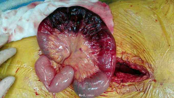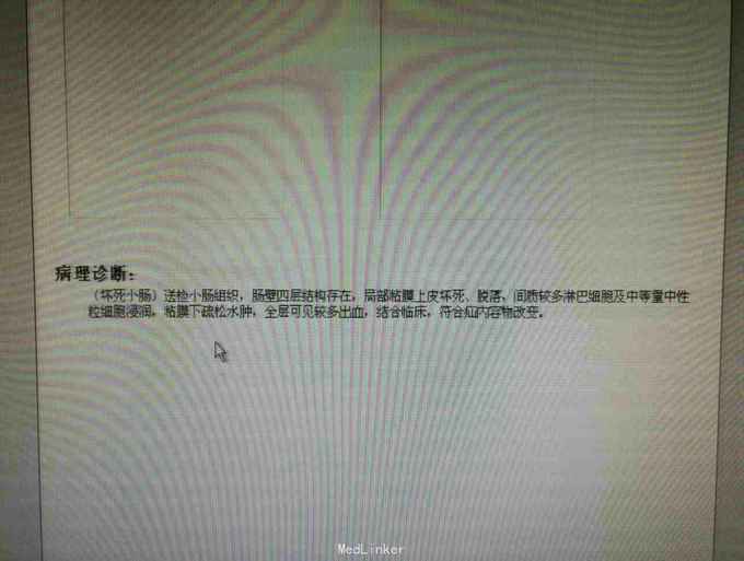 入院后急查血象稍高,完善急诊CT示内疝并闭袢性肠梗阻,予急诊行剖腹探查,术中见子宫右移,距离回盲部50cm回肠内疝入子宫与前腹壁所形成的黏连中,松解黏连,见回肠约15cm缺血坏死,予切除后吻合,缝闭黏连所造成的腔隙,关腹。术后常规治疗,患者回复可予出院。病理如图。