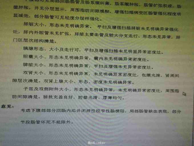 中年女性,因腹痛伴恶心,呕吐一天急诊入院,腹痛以肚脐和中下腹明显,间断性绞痛伴恶心,呕吐,无伴其它不适。既往5年前曾行剖宫产术