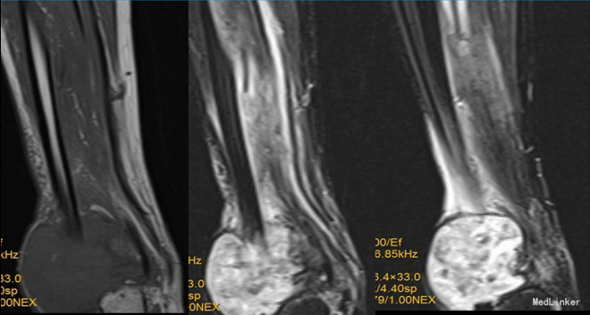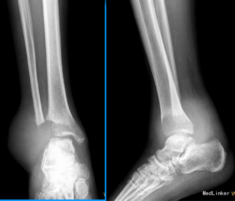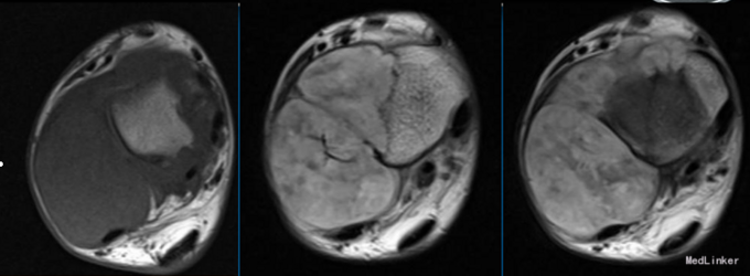 查体:右外踝肿胀,皮肤颜色暗红色,皮温增高,右侧踝可触及质韧肿物,基地广泛,移动度差,肿物按压有轻度胀痛,无叩痛。 辅查:右胫腓骨X线片示:右胫腓骨远端骨质缺失,周围软组织肿胀,不除外骨肿瘤,建议进一步检查。行MRI示:右胫腓骨远端肿物,考虑恶性肿瘤。实验室检查未见明显异常。