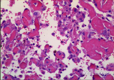 入院诊断:右胫腓骨肿物。入院后行穿刺活检,活检病理示:送检组织见成簇大小不等增生的血管,血管间可见增生的纤维母细胞及硬化的胶原,部分似毛细血管,血管内皮细胞增生,少许呈乳头状伴有纤维素渗出,成簇增生的小血管想骨组织内浸润性生长;结合影像学改变考虑侵袭性血管瘤病。患者予唑来膦酸治疗,治疗后骨化明显,右踝关节胀痛明显缓解。