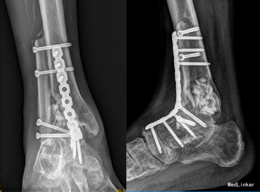 1年后患者行右踝关节肿物切除+踝关节融合取腓骨重建术。