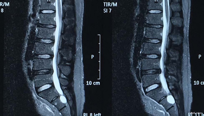 查体:脊柱生理弯曲存在,腰椎活动受限,L4/L5,L5/S1棘突压痛叩痛,叩击痛。左侧直腿抬高试验(+),约35°,加强试验(+),约30°。左下肢外侧皮肤感觉稍减退,右侧正常。双侧髂腰肌、股四头肌肌力Ⅴ级、左侧胫前肌、踇背伸肌肌力Ⅳ级,腹壁反射、肛门反射正常,两侧膝正常,双侧踝反射对称减弱。双侧Babinski征(-),双侧皮温及色泽正常,双侧足背动脉搏动良好。 辅助检查:腰椎磁共振检查显示:腰4/5椎间盘向左后方突出,压迫左侧神经根。骶管骶4水平发现一大小约2*3*3大小的囊肿。