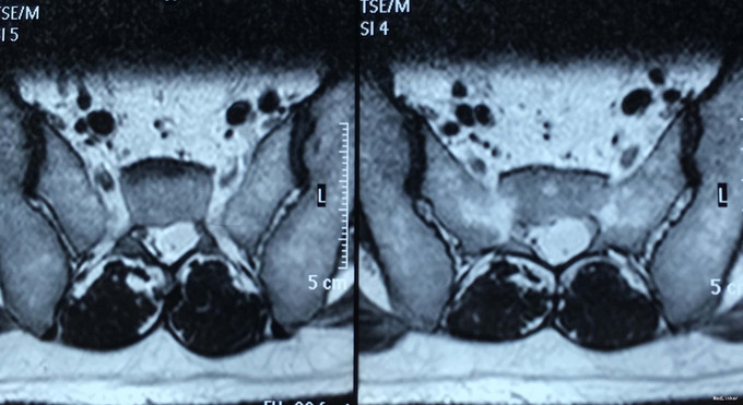 随访:术后1个月随访,患者诉腰臀部疼痛明显缓解,左小腿麻木感减轻。 讨论:该患者术前椎间盘突出并不严重,而且合并骶囊肿,须仔细查体,明确责任病灶。骶管囊肿也可引起腰臀部疼痛不适感,术前须与患者交代清楚,手术摘除椎间盘有可能不能完全缓解症状,因骶管囊肿切除并发症较多,建议其随访观察。患者术后满意。