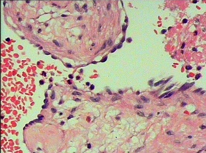 随访:(肝S4/5段血管瘤)海绵状血管瘤;周围肝组织小叶结构保存,肝细胞胞浆内见较多胆色素颗粒;“切缘”未见肿瘤。 讨论:肝海绵状血管瘤是肝脏最常见的良性肿瘤,约占肝脏良性肿瘤的84%,一般无临床症状,常为体检中发现。海绵状血管瘤内的血窦和血窦内缓慢流动的血液形成MRI颇具特征性表现,T2WI呈均匀高信号,随着回波时间延长,信号强度增高,临床上称为灯泡征。增强扫描呈“快进慢出”表现,即动脉期边缘结节样明显强化,门脉期及静脉期强化逐渐向中央扩展。影像学表现较具特征性,诊断不难。