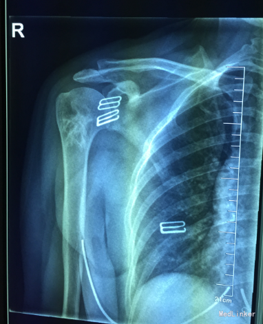 诊断:右肱骨近端骨纤维异常增生症.讨论:术后给予消肿,止痛,胸背疼痛较前缓解,伤口愈合良好,局部无红肿硬节及渗出,出院后应将逐步适量功能锻炼;伤口定期换药,术后两周拆线,加强营养支持,补钙治疗,促进骨愈合。
