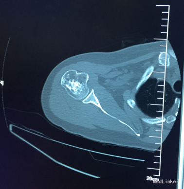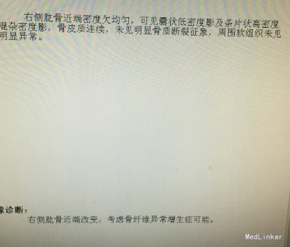 右肩X片示:右肱骨近端髓腔片状高密度混杂影,行CT为右侧肱骨近端改变,考虑骨纤维异常增生症可能。