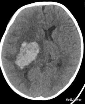 查体:T:36.8℃,P:173次/分,R:30次/分。神志清楚,舌下见约3*2cm水泡,左侧肢体肌力3级,右侧肢体肌力5级。辅助检查:院外CT:右侧基底节区出血。右侧基底节-顶叶区脑出血,大小约5.2cm×3.3cm,周围见大片状水肿带,右侧脑室受压变窄,中线结构左侧移位,环池不对称。CTA示:未见确切异常。全脑血管造影提示:颅内血管未见异常。寄生虫检查示:“猪囊尾蚴IgG阳性,血常规提示缺铁性贫血。