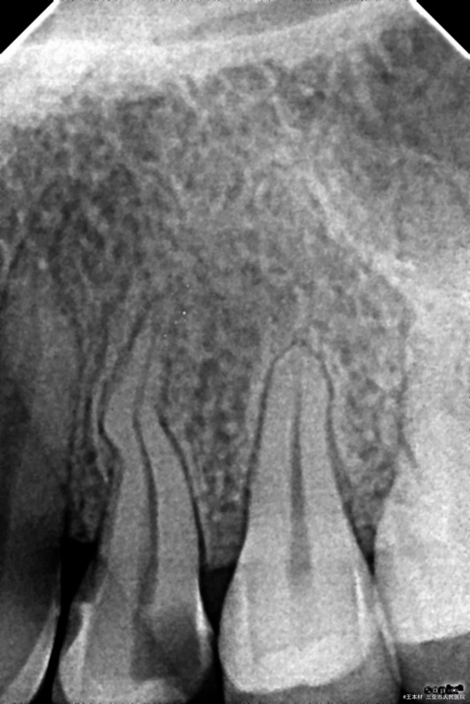 诊断:24#急性牙髓炎 处置:24#调咬合,去暂封,取失活,去净腐质,髓室预备,暴露髓室底,根管口探查,GG钻(1-3#)扩大根管口,拔髓,根管探查疏通,根管预备至:PWL=16.0,40#,根尖定位仪根管长度测量,WL=B:19.5mm,P:19.0mm,均35#,参照点为平各自牙尖,EDTA凝胶,0.7%NaClO冲洗,棉捻干燥,CP棉球,ZOE简单充填。 医嘱:全身抗炎阿莫西林,治疗其间勿用患侧咀嚼硬物,5日后复诊,不适随诊。 5日后复诊如下: 主诉:患牙无明显异常。 检查:24#封物完好,髓室内清洁,叩诊叩痛(-),棉球无异味,余无明显异常。 处置:24#去暂封,取棉球,NaClO冲洗,棉捻干燥,牙胶尖+氢氧化钙碘仿糊剂根管充填,玻璃纤维桩,3MZ350树脂修行充填。 医嘱:2小时后使用患侧进食,择期冠修复,随诊。