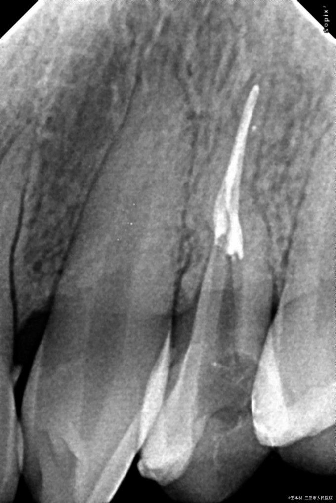 主诉:左上后牙治疗未完成,来我处继续治疗。 现病史:患牙食物嵌塞史,疼痛1日,首诊诊断“急性牙髓炎”,并开髓失活,因根管弯曲转诊。
