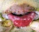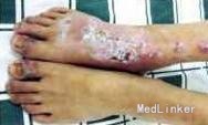患者男,47岁,反复口腔溃疡1年余,全身反复水疱9个月余。 患者于1年前发热后口腔出现多处疼痛性溃疡,诊治不详,无好转,2个月后龟头上也出现糜烂和疼痛,曾到某口腔医院诊治,诊断为白塞病,治疗后(具体不详)龟头糜烂好转,但口腔溃疡仍反复。 就诊前9个月,双手掌出现散在的红斑和水疱,伴瘙痒,之后四肢和躯干多处出现红斑和水疱,瘙痒剧烈。患者一直用中药煎剂治疗,病情反复。 就诊前20天皮疹增多,全身出现水疱、糜烂和结痂,口腔溃疡加重,逐渐波及到双唇、鼻黏膜和眼睑缘,溃疡表面结痂,张口受限,遂到我院,查血常规、Trust试验、HIV抗体均正常,予抗过敏药物效果不佳。 发病以来患者体重减轻10kg,无关节疼痛和发热,家族中无类似病史。