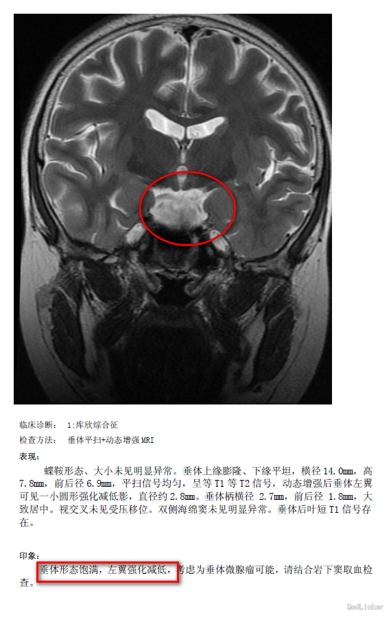 1、垂体平扫+动态增强MRI 蝶鞍形态、大小未见明显异常。垂体上缘膨隆、下缘平坦,横径14.0mm,高7.8mm,前后径6.9mm,平扫信号均匀,呈等T1等T2信号,动态增强后垂体左翼可见一小圆形强化减低影,直径约2.8mm。垂体柄横径2.7mm,前后径1.8mm,大致居中。视交叉未见受压移位。双侧海绵窦未见明显异常。垂体后叶短T1信号存在。垂体形态饱满,左翼强化减低,考虑为垂体微腺瘤可能,请结合岩下窦取血检查。 2、小剂量地塞米松抑制试验未被抑制,大剂量地塞米松试验抑制。BIPSS试验提示双侧岩下窦ACTH均明显升高,与外周存在明显梯度,使用去氨加压素前IPS/S>2,使用去氨加压素之后IPS/S>3。垂体平扫+动态增强MRI提示垂体形态饱满,左翼强化减低,考虑为垂体微腺瘤可能。