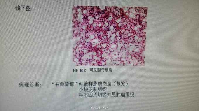 完善相关检查后考虑原脂肪肉瘤复发,全麻下行右背部包块扩大切除术及皮瓣转移术。手术顺利,恢复良好。术后病理提示粘液样脂肪肉瘤复发。