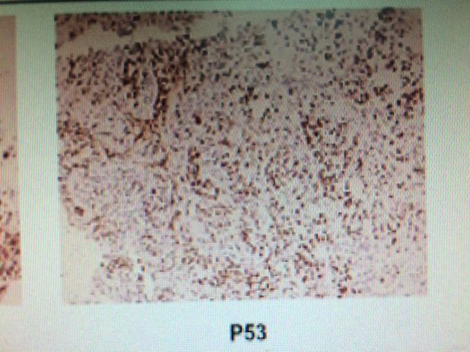 患者,女,25岁。 主诉:间歇性剑突下隐痛3月。 现病史:患者于3月前饮食无规律后出现剑突下隐痛不适,进食后有腹胀,偶有恶心、呕吐,呕吐少量胃内容物。1月前患者腹痛较前加重,伴恶心呕吐,至我院急诊就诊,给予抗感染抑酸护胃治疗(头孢西丁、泮托拉唑),患者腹痛及恶心呕吐较前稍好转,09-23查上腹部CT示:胃窦部胃壁明显增厚,周围腹腔多发软组织影。09-24胃镜检查示:胃体下部大弯处可见一巨大凹陷性上覆污苔,周围粘膜呈堤状隆起,蠕动消失,组织硬,触之易出血,考虑胃巨大溃疡。病理回报:(胃体)粘液腺癌,部分印戒细胞癌。09-26给予奥沙利铂200mg+替吉奥 40mg 2/日 方案化疗。 既往史:既往健康状况良好。 家族史:奶奶患“胃癌”目前一般情况差。