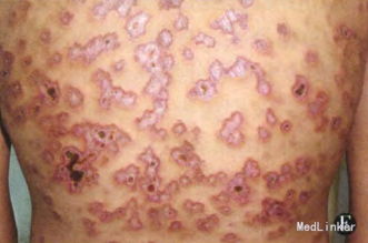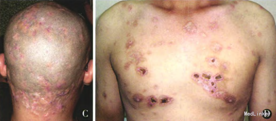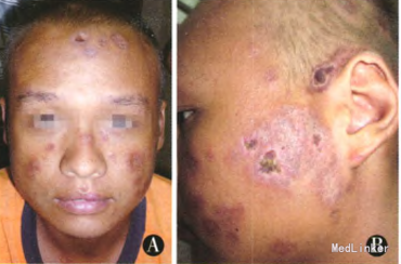 患者男,24岁。因头面部、躯干及双上肢紫红色斑、溃疡伴脱发15个月就诊。1年多以来,患者背部出现紫红色斑,皮疹渐扩大成斑块并出现溃疡,后形成萎缩性瘢痕。皮疹逐渐扩展至头面部及双上肢,其中面部以鼻根部、颧部和面颊为主,且头部皮疹引起脱发,否认口腔溃疡及关节痛。