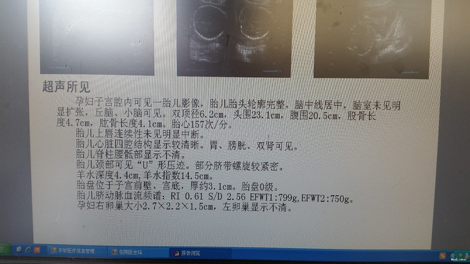 查体:一般状态良好,心肺未及异常,腹膨隆,宫高17厘米,腹围83厘米,未及宫缩,胎心144次/分。彩超:双顶径5.8厘米,股骨4.1厘米,羊水指数4.8厘米,W 589-603G.