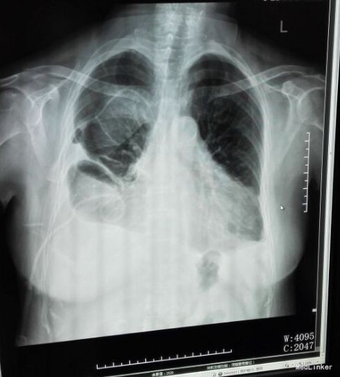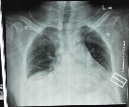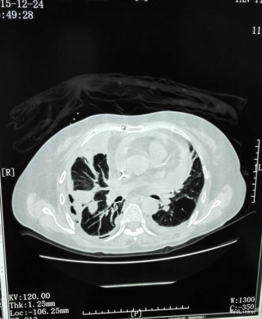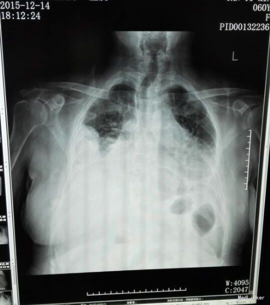 患者入院后予“美洛西林舒巴坦”抗感染,当天晚上出现明显气促,伴右后下背痛,无明显发热,当时复查胸片示: 1、双下肺炎症、双侧胸腔积液,同2015.12.13前片比较,考虑右侧胸腔积液明显增多,部分包裹,建议CT进一步检查。血气分析未见明显异常,2015-12-14 复查急诊血常规:白细胞计数 24.290(10E9/L)↑,淋巴细胞计数 0.750(10E9/L)↓,中性粒细胞比例 0.930↑,血红蛋白浓度 104.000(g/L)↓,中性粒细胞计数 22.590(10E9/L)↑,红细胞计数 3.500(10E12/L)↓,血小板计数 466.000(10E9/L)↑,单核细胞计数 0.920(10E9/L)↑;急诊肾功(三项):尿素氮 8.450(mmol/L)↑;急诊电解质(K/Na/Cl):钠 128.700(mmol/L)↓,氯 87.100(mmol/L)↓; 2015-12-14胸部及上腹部CT平扫+增强示:1、两中下肺多发炎症,部分萎陷。建议治疗后复查。2、双侧胸腔积液(右著);心包少量积液。3、结合病史,右输尿管术改变;右侧双J管置入术后。右肾、输尿管上段扩张、积水,右肾周感染并少许积气;左肾结石。4、脂肪肝。5、胆、脾、胰未见异常。因CT提示肺部大片实变,包裹性积液(量少),考虑重症肺炎可能,于2015-12-14将抗生素升级为“亚胺培南西司他丁 1.0 q8h、万古霉素 50万U q12h、伏立康唑 0.2 q12h”三联,同时予“甲强龙”抗炎等治疗。经治疗,患者气促症状逐渐缓解,咳嗽、咳痰、右后背疼痛好转,无发热,精神、胃纳较前改善。因B超定位下胸水量少,暂未予胸穿。2015-12-17复查胸部+上腹部CT平扫示:1、双中下肺炎炎症较前吸收好转,右侧胸腔积液较前略有减少,左侧胸腔积液现已基本吸收。2、胸、腹主动脉粥样硬化;心包少量积液(大致同前)。纵膈内临界肿大淋巴结。3、右输尿管术改变;右肾、输尿管上段扩张、积水,右肾周慢性感染(原右肾周积气消失);左肾结石。4、轻度脂肪肝。少量腹水。5、胆囊内斑片状高密度影,考虑胆汁淤积。2015-12-19 复查血常规:白细胞计数 18.160(10E9/L)↑,中性粒细胞比例 0.918↑,血红蛋白浓度 105.000(g/L)↓,中性粒细胞计数 16.670(10E9/L)↑,红细胞计数 3.560(10E12/L)↓,血小板计数 396.000(10E9/L)↑,淋巴细胞比例 0.037↓,红细胞压积 0.305↓,单核细胞计数 0.780(10E9/L)↑;降钙素原 2.000(ng/ml)↑;急诊肾功(三项):肌酐 146.000(umol/L)↑,尿素氮 19.580(mmol/L)↑。2015-12-20患者精神较前明显变差,伴纳差、乏力,气促较前加重,2015-12-20再次复查血常规:白细胞计数 33.230(10E9/L)↑,中性粒细胞比例 0.967↑,红细胞计数 3.350(10E12/L)↓,中性粒细胞计数 32.130(10E9/L)↑,血红蛋白浓度 99.000(g/L)↓,单核细胞比例 0.016↓,淋巴细胞比例 0.016↓,红细胞压积 0.293↓;2015-12-20 急诊肾功(三项):肌酐 125.000(umol/L)↑,尿素氮 15.960(mmol/L)↑;降钙素原 0.836(ng/ml)↑;复查胸片示:1、同2015.12.17胸部CT比较,考虑右侧胸腔积液较前有所增多,大部分为包裹性积液,新发左侧胸腔少量积液;右肺情况显示不清,左下肺炎症。2、心影增大,结合CT考虑心包积液;主动脉粥样硬化。遂行胸腔穿刺术,抽出400ml黄白色脓性胸水,胸水常规:PH6.0,WBC54600*10E6/l,中性粒0.97,胸水生化:乳酸脱氢酶 2221.000(U/L);葡萄糖 1.180(mmol/l),总蛋白 24.000(g/l),腺苷脱氨酶 154.000(U/L),氯 106.800(mmol/L)。符合脓胸改变,予右侧胸负压腔闭式引流,同时予“庆大霉素16万u”冲洗,将抗生素降级为莫西沙星片口服,患者症状明显好转,12.24复查胸片及CT胸腔积液及肺炎均较前明显好转。