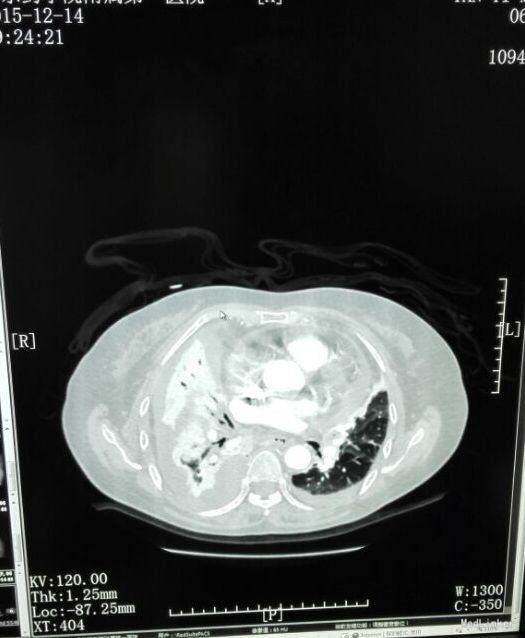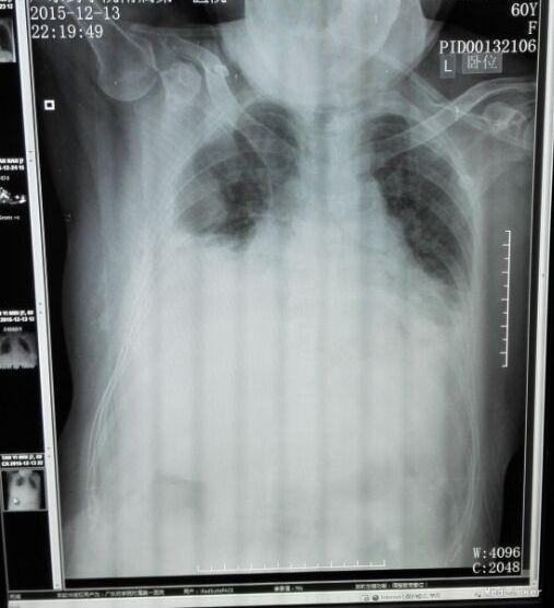 入院查体:体温:36.3℃(X),呼吸:25次/分,脉搏:105次/分,血压:160/80mmHg。神志清楚,平车入室,查体合作。全身皮肤未见皮疹,未见皮下出血点,浅表淋巴结未扪及肿大,咽充血++,扁桃体Ⅰ度肿大,可见滤泡,未见脓点,颈软,气管居中。胸廓无畸形,呼吸稍促,双肺呼吸音粗,右下肺叩诊稍浊,语音震颤增强,双下侧肺野可闻及少许湿啰音,未闻及干啰音,未闻及胸膜摩擦音。心界不大,心率105次/分,律齐,未及杂音,腹膨隆,无压痛、反跳痛,肝脾肋下未触及,肠鸣音减弱,双下肢无水肿。病理征未引出。 门诊辅助检查: 2015-12-13我院急诊查血常规示白细胞计数 14.21 (10E9/L),中性粒细胞比例0.871,淋巴细胞比例 0.049 ,单核细胞比例0.077 ;胸片示:“双下肺炎症、双侧胸腔少量积液;主动脉粥样硬化”,凝血四项PT16.7,急诊血糖:10.75mmol/l,电解质:Na131mmol/l,CL87mmol/l,肝功:Bc8.2umol/l,肾功、心肌酶、三项未见明显异常。