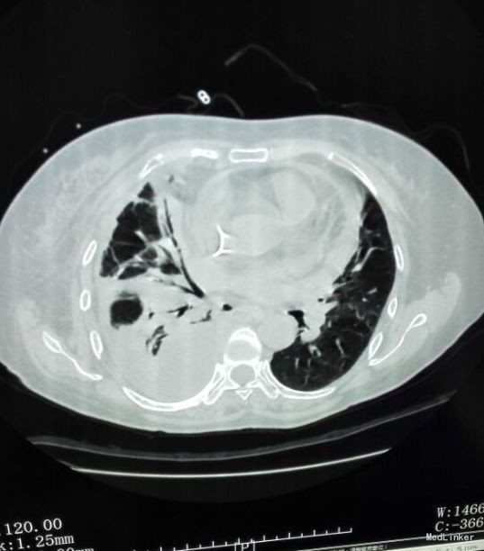 患者,女性,60岁。因“咳嗽、咳痰1周,伴发热、右后下背疼痛1天”入院。 患者1周前起因受寒后出现发热,最高体温38.3℃,伴咳嗽、咳痰,痰少,不易咳出,咳白色黏痰,伴有头痛、全身乏力,无畏寒、寒颤,无肌肉酸痛,无鼻塞、流涕、咽痛,无胸痛、胸闷、气促,无腹痛、腹泻、呕吐,无尿频、尿急、尿痛,于当地社区医院就诊,当时予消炎(头孢类)处理后头痛症状有所好转。后于当地中医院就诊,予服用中药治疗后,患者相关症状无改善。一天前晚上患者无明显诱因出现反复发热,最高体温为37.5℃,有右后下背疼痛,以深呼吸时明显,伴有气促、大汗淋漓、畏寒、寒战,有腹胀感。遂今日于我院急诊就诊,查血常规示:白细胞计数 14.21 (10E9/L),中性粒细胞比例0.871,淋巴细胞比例 0.049 ,单核细胞比例0.077 ;胸片示:“双下肺炎症、双侧胸腔少量积液”,予静脉注射“ 拉氧头孢针 ”治疗后未见好转,仍反复发热,右后下背疼痛明显,伴气促、大汗淋漓,遂收入我科进一步诊治。 既往史:否认肝炎、结核等传染病史,否认高血压史、冠心病史、糖尿病等慢性病史,2015-04有小腿部丹毒病史,2015-05因“肾积水”于外院就诊,发现右侧输尿管狭窄,并行支架置入术,住院期间并发右侧胸前区“带状疱疹”。否认外伤史、输血史,否认过敏史,预防接种史不详。