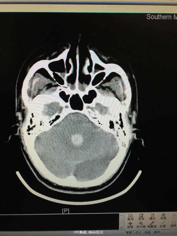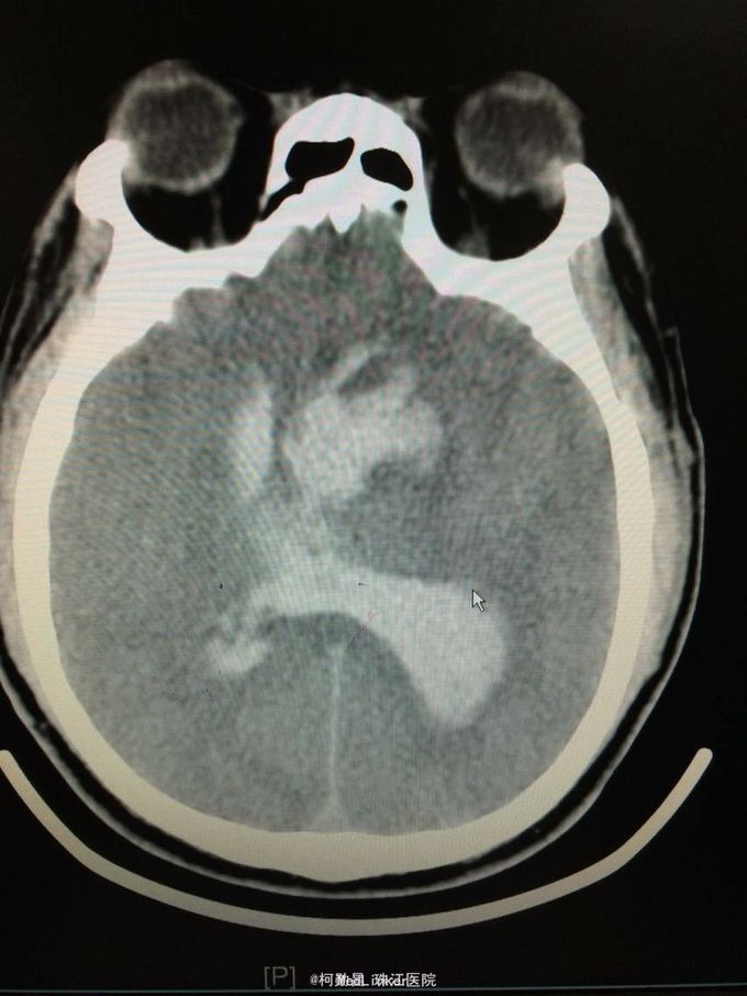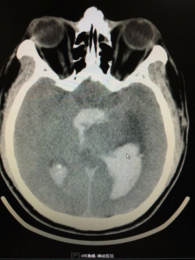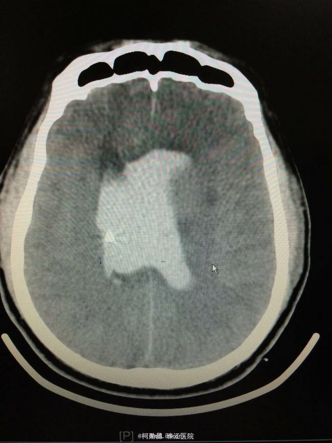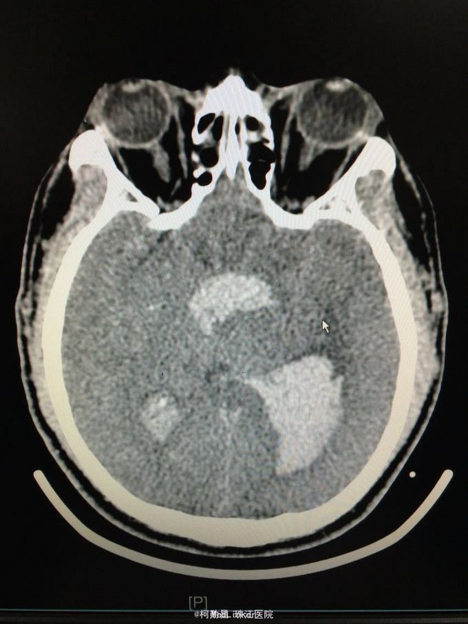 随访:患者最终死亡。 讨论:该患者属于典型的高血压性脑出血,且出血量多,预后不良。壳核和丘脑是高血压性脑出血的两个最常见部位。典型可见三偏体征(病灶对侧偏瘫、偏身感觉缺失和偏盲等),大量出血可出现意识障碍,也可穿破脑组织进入脑室,出现血性CSF,直接穿破皮质者不常见。