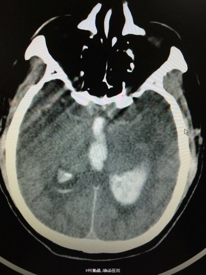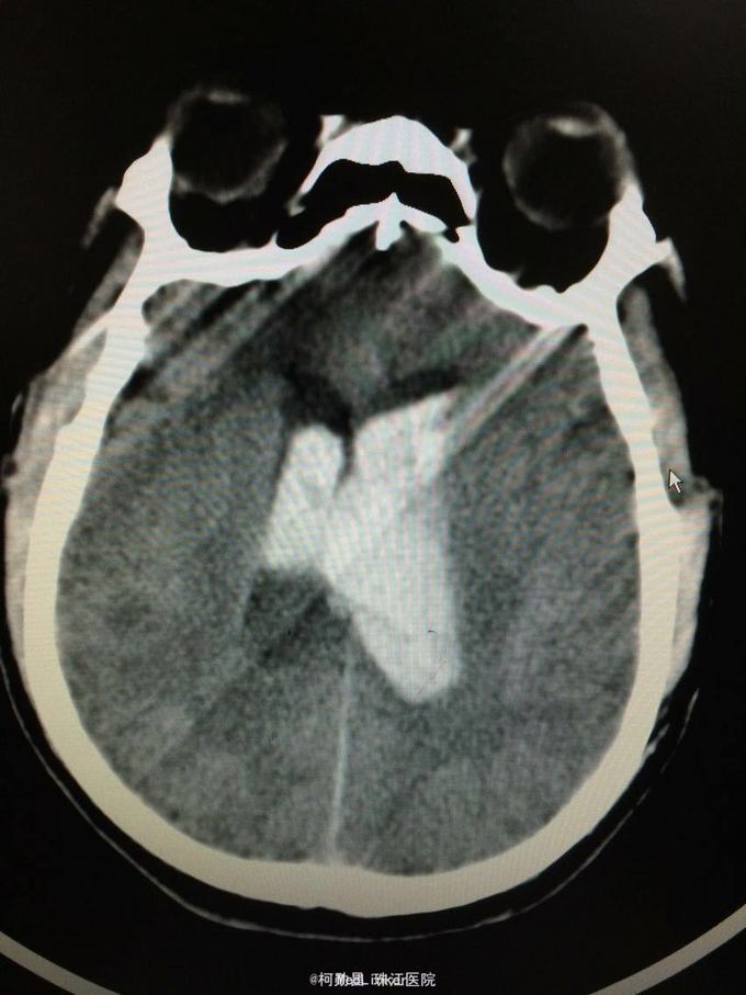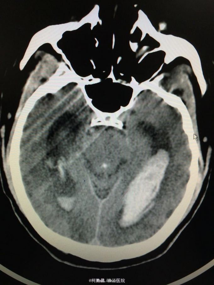 诊断:左侧基底节区出血并破入脑室 处理:急诊行侧脑室钻孔外引流术,术后并予积极抢救,最终抢救无效死亡
