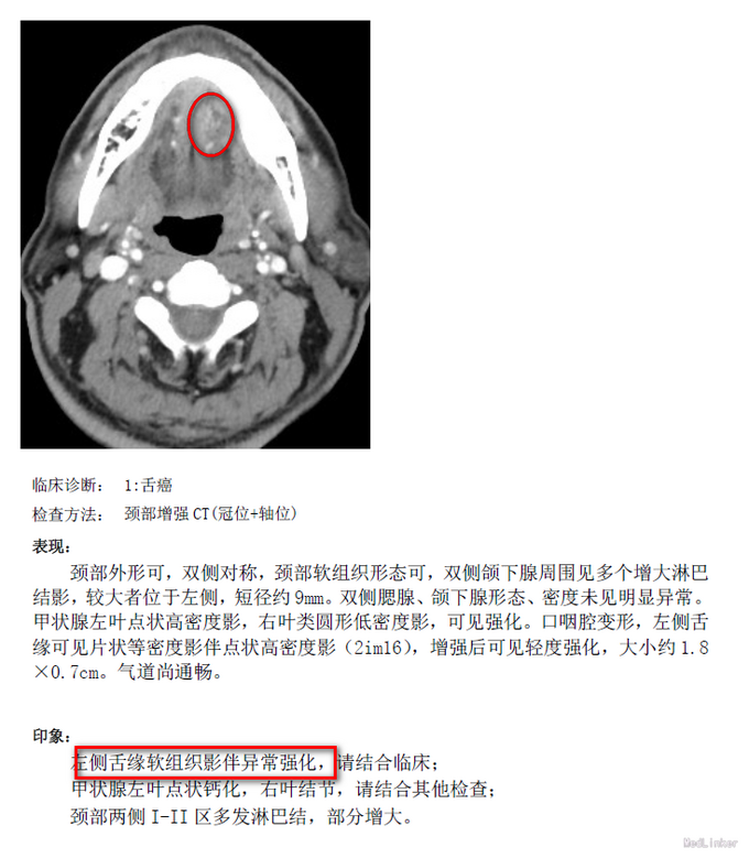 患者 男 77岁 主 诉:左侧舌肿物伴疼痛10个月。 现病史:患者4年前发现左侧舌腹有无痛性的白色斑块。2年前于当地医院给予药物治疗无效后,未再治疗。今年2月份,患者发现左舌腹白色斑块中央,有一突起于表面的“黄豆”大小的肿物,无疼痛,直至今年4月份肿物增大且突感疼痛。后于今年8月来我科就诊,予以局部用药,未见疗效。患者又于今年10月底复诊,行左舌腹肿物活检术,病理示:左舌腹白色斑块癌变。后门诊以“左舌腹鳞状细胞癌”为诊断收入院。近一个月以来,肿物生长加快,目前为“硬币”大小。 既往史:高血压病史15年。