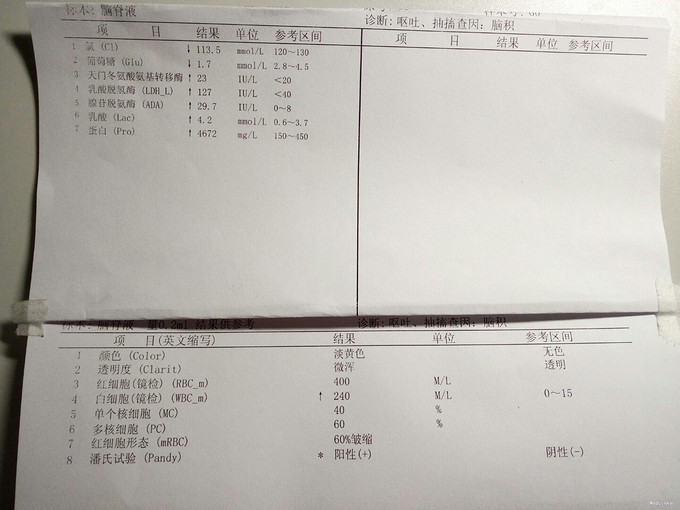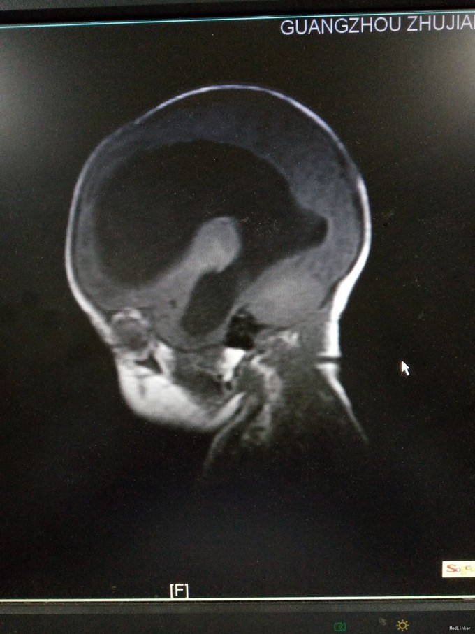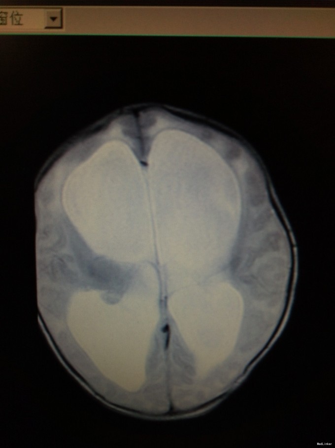 查体:发育正常,神清,反应欠佳。前囟3.5*3.5cm,隆起,张力稍高,颅缝分离约0.5cm。双肺呼吸音粗糙,心腹未及明显异常。四肢肌张力稍高,生理反射可引出,病理反射未引出。入院后完善颅脑CT、腰椎穿刺术等,结果如下。