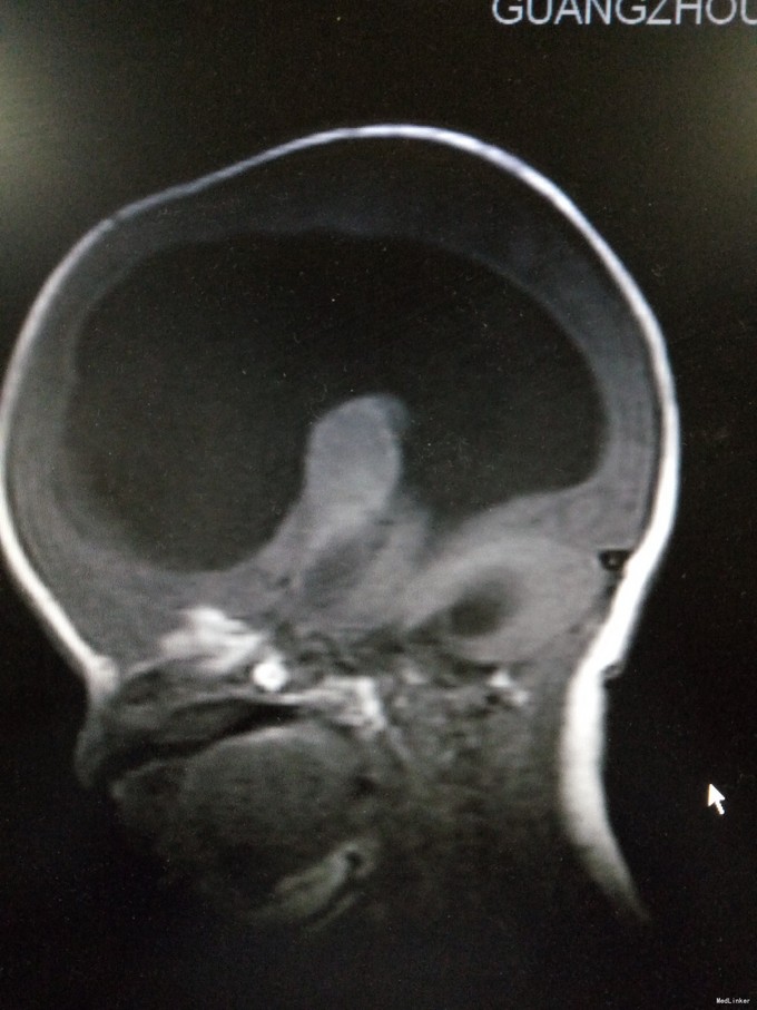 初步诊断为:1.交通性脑积水;2.化脓性脑膜炎。入院后予美罗培南抗感染、营养脑神经、维持内环境平衡等治疗。请神经外科会诊后建议行脑室-腹腔分流术。经近2周治疗后,患儿症状有好转,但病情尚不稳定,家属要求出院,予签字出院。