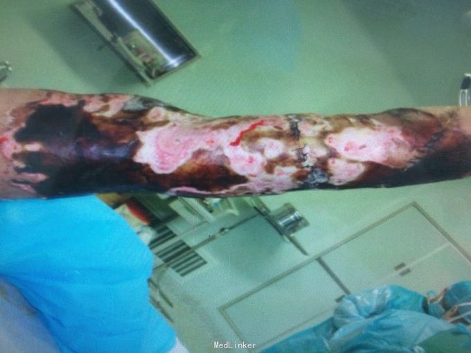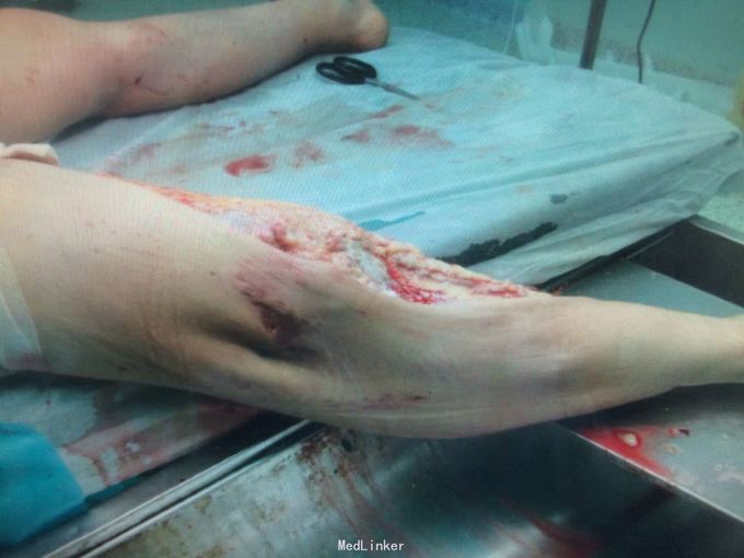 左下肢毁损伤。急诊在全麻下清创缝合,剥脱皮肤用鼓式取皮器把剥脱的皮肤削薄后原位回植后加负压吸引术