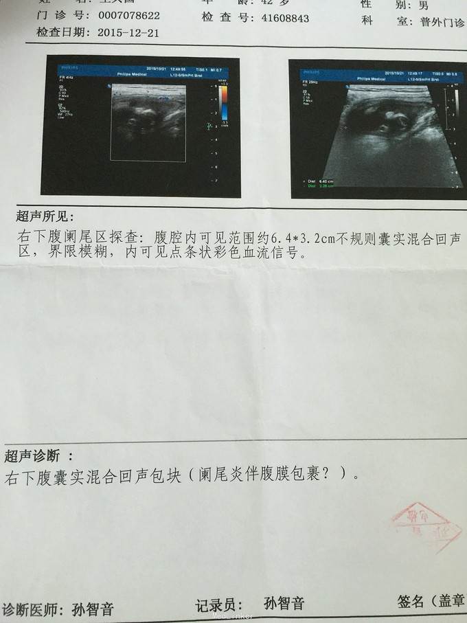 患者入院一周,腹部症状明显改善,查体腹部包块明显缩小,复查各理化指标恢复正常,患者要求出院,经上级医师批准出院,并建议定期复查,择期行阑尾切除术。针对阑尾炎周围脓肿患者行手术治疗的时间窗个人一直不是很明确,望有经验的各位同仁多多指教。谢谢