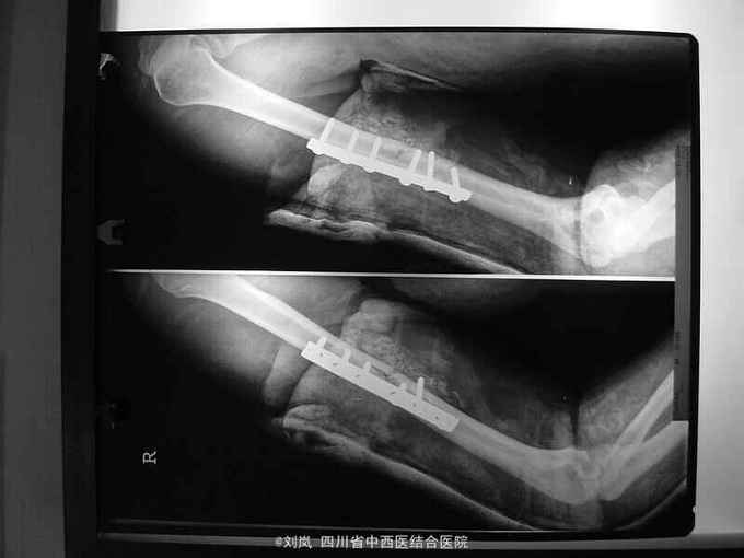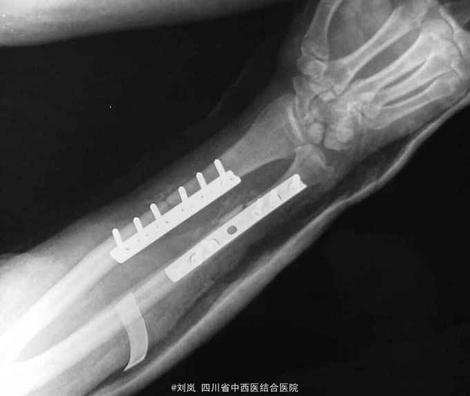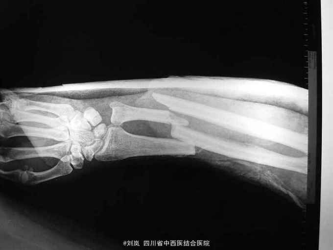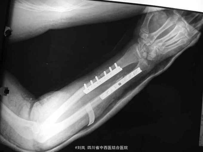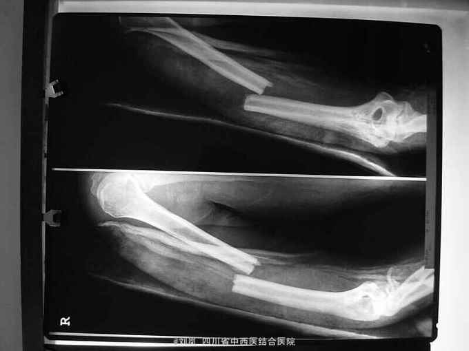 入院诊断: 1、高处坠落伤 2、脑挫裂伤 3、小肠部分坏死 小肠穿孔 肠系膜挫伤 4、右肱骨中段骨折 5、右尺桡骨中下段骨折 6、腹腔积气 7、右第7、8肋可疑骨折 8、轻度贫血 9、全身多发皮肤软组织挫伤 转入诊断: 1、高处坠落伤 2、右肱骨中段骨折 3、右侧尺桡骨中下段粉碎性骨折 4、脑挫裂伤(右,顶叶) 5、右侧桡神经损伤 6、右侧正中神经损伤 7、右侧尺神经损伤 8、右前臂Volkmann缺血性肌痉挛 9、右侧第7肋、左侧第8肋骨骨折 10、小肠部分切除、小肠修补、阑尾切除术后 11、右膝清创缝合术后 12、腹腔积气 13、轻度贫血 14、全身多发皮肤软组织挫裂伤 治疗: 患者急诊入院后,予完善检查,诊断明确,完善急诊手术准备,急诊在全麻下行了“剖腹探查:小肠坏死部分切除、小肠修补+阑尾切除术+腹腔引流术”,术后在ICU继续抗炎、止血、补液脱水监护对症治疗,并请骨科会诊后予右上肢石膏固定。 术后两周外科病情平稳,再次请骨科会诊后转骨科治疗。转入后进一步完善相关检查及术前准备,诊断明确后,在“全麻”下行了"右肱骨中段骨折切开复位内固定、右尺桡骨中下段骨折切开复位内固定术+植骨术、右侧桡神经损伤探查术",术中见桡神经挫伤明显,局部瘀血及增生组织包裹,予松解处理。术后予消肿、止痛、营养神经、预防感染等对症支持治疗,结合针灸、理疗、中药口服及康复治疗。术后伤口愈合及拆线后,予中药熏洗治疗,配合患肢主被动功能康复锻炼,住院2个月,患肢功能活动明显改善,病情好转出院。