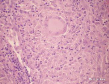 查体:一般情况良好,生命体征正常,全身浅表淋巴结未触及肿大,心肺及腹部检查无异常。皮肤科检查:右耳切除处见红褐色浸润性斑块,触之柔软,界限清楚,融合成大瘢痕。实验室检查:血常规、尿常规、肝肾功能均正常,胸部X线检查无异常;结核菌素试验强阳性(硬结直径超过20 mm)。血红细胞沉降率升高。皮损真菌培养阴性,快速血浆反应环状卡片试验(RPR)及梅毒螺旋体血凝试验(TPHA)均为阴性。皮损病理检查显示:表皮棘层肥厚,角化过度乳头瘤样增生,真皮浅层弥漫性淋巴细胞、中性粒细胞浸润。其中可见结节样的上皮样细胞和多核巨细胞,中央可见干酪样坏死。皮损分泌物通过分枝杆菌培养4周阳性,菌型鉴定为结核分枝杆菌。